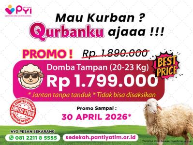 Qurban praktis, amanah, dan penuh keberkahan. Paket Tampan menghadirkan domba jantan tanpa tanduk yang disalurkan langsung untuk kebahagiaan yatim dan dhuafa.