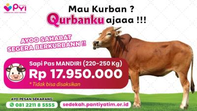 Tunaikan ibadah qurban Anda tahun ini melalui program Sapi Pas Mandiri dari PYI Yatim & Zakat. Dengan harga Rp 17.950.000, Anda sudah berqurban satu ekor sapi jantan sehat dengan bobot 220-250 kg.